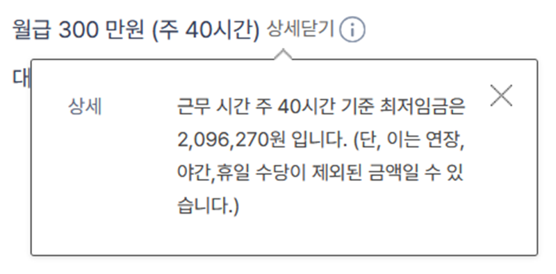 5. 급여 항목 옆의 안내를 살펴보면 세부적인 내용을 알 수 있습니다. 월급 300만 원은 주 40시간 근무 기준이며, 최저임금은 약 209만 원이라는 점과 함께 연장, 야간, 휴일 수당은 별도로 책정될 수 있다는 점을 명확히 하여 오해가 없도록 돕습니다.
