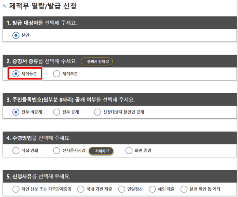 5. 신청 화면에서 발급 대상자를 선택하고 증명서 종류에서 '제적등본'을 다시 한번 확인합니다. 주민등록번호 공개 여부나 수령 방법 등 필요한 항목을 차례대로 정하면 됩니다.