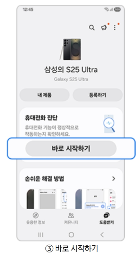 3. 도움받기 화면 중간쯤에 '휴대전화 진단'이라는 항목이 있습니다. 여기서 '바로 시작하기' 부분을 눌러 진단 기능을 시작할 수 있습니다.