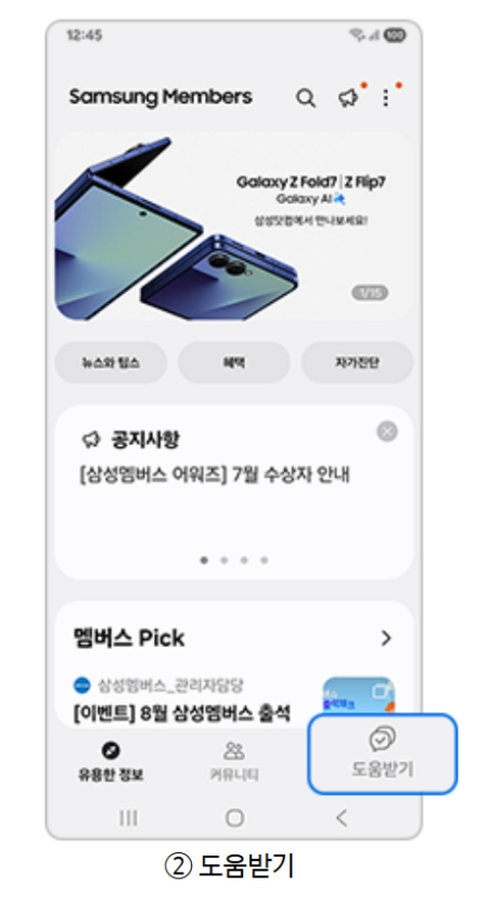 1. 먼저 갤럭시 휴대폰에 기본적으로 설치되어 있는 '삼성 멤버스' 앱을 찾아서 실행해 주세요. 파란색 바탕에 'M' 글자가 그려진 아이콘을 찾으면 됩니다.