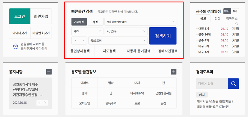 3. 메인화면 가운데 빠른 물건 검색 기능을 활용하면 경매 물건을 더 쉽게 찾을 수 있어요. 법원이나 지역명을 입력해 간편하게 검색할 수 있으며 여러 가지 조건을 설정해 더욱 정밀한 검색도 가능해요. 예시로 검색을 해보도록 하겠습니다.