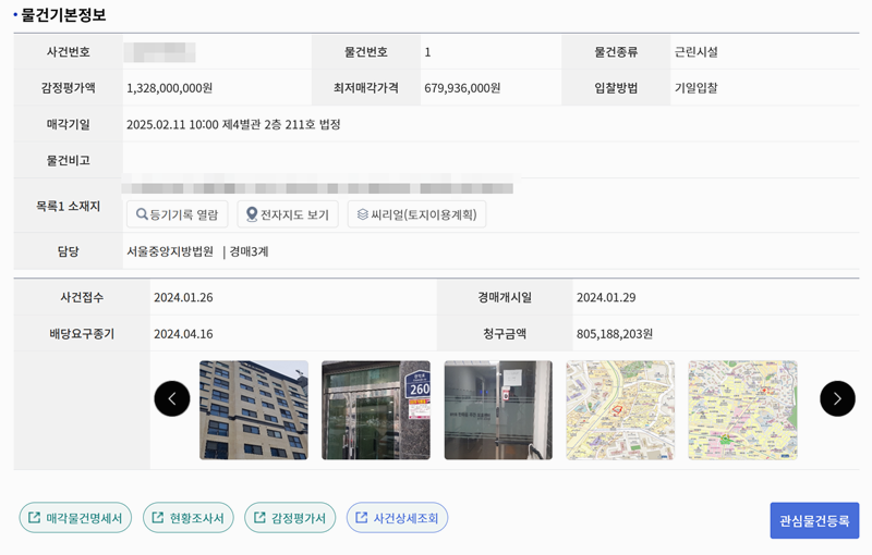 5. 경매 물건은 근린시설로 감정평가액과 최저매각가격이 함께 제공돼요. 사건번호, 물건번호, 매각기일 같은 기본 정보와 함께 입찰 방법도 확인할 수 있어요. 또한 소재지와 물건의 특이 사항이 정리되어 있어요. 사건 접수일, 경매 개시일, 청구금액 같은 세부 일정과 금액 정보도 포함되어 있어 절차를 이해하는 데 도움이 돼요.