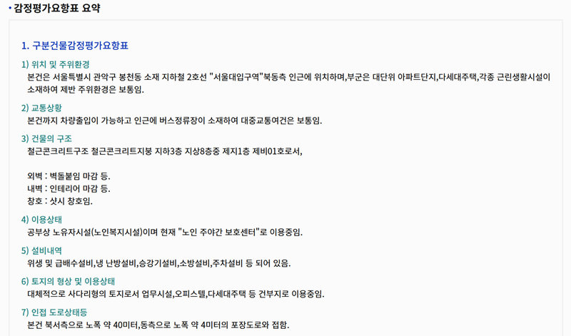8. 감정평가요항표에서는 경매 물건의 가치를 산정한 주요 내용을 확인할 수 있어요. 물건의 위치, 면적, 구조 같은 기본 정보와 함께 평가액이 어떻게 결정되었는지도 알 수 있어요. 또한 가격 산정 기준, 인근 시세 같은 추가 정보가 포함돼 있어 입찰을 고려하는 사람들이 참고하기 좋아요.