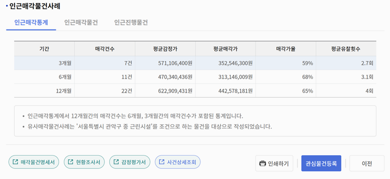9. 인근 매각 물건 사례와 통계를 통해 주변에서 진행된 결과를 확인할 수 있어요. 매각 건수, 평균 감정가, 평균 매각가 같은 정보를 제공해 시장 가격을 비교하는 데 도움이 돼요. 또한 매각가율과 평균 유찰 횟수도 함께 제공돼 경매 성공 가능성을 예측하는 데 유용해요. 이런 정보들은 입찰 전에 주변 시세를 파악하는 데 활용할 수 있어요.