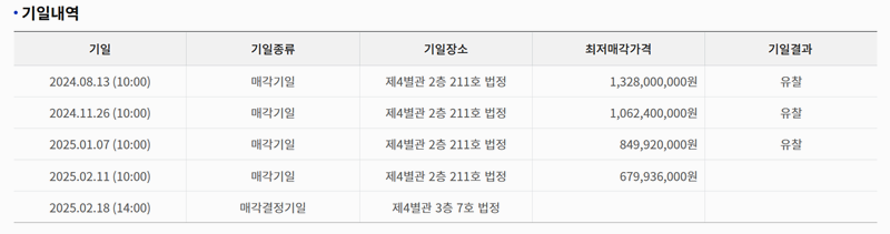 6. 기일 내역에서는 매각이 진행되는 날짜와 관련된 정보를 확인할 수 있어요. 기일 종류와 장소가 함께 안내되며 최저매각가격도 표시돼요. 또한 매각이 성사되었는지 여부를 나타내는 기일 결과도 제공돼요.