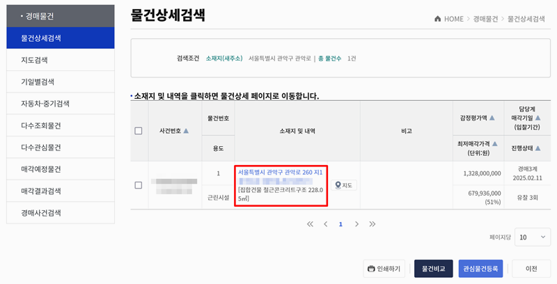 4. 검색 결과에서는 사건번호, 용도, 소재지 및 내역, 금액 등이 함께 표시되어 물건의 기본적인 정보를 한눈에 확인할 수 있어요. 특히 소재지 및 내역 항목을 선택하면 해당 물건의 상세 페이지로 이동할 수 있어요. 상세 페이지에서는 물건의 위치, 구조, 면적, 금액 등 보다 구체적인 내용을 확인할 수 있어 경매 참여를 고려하는 사람들에게 유용한 정보를 제공해 줘요.