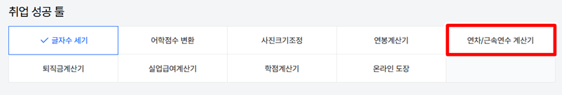 3. 취업 성공을 위한 다양한 계산 도구들이 탭 형태로 정리되어 있는 것을 볼 수 있습니다. 글자 수 세기나 어학 점수 변환 등 여러 기능 중에서 가장 오른쪽 끝에 위치한 연차/근속연수 계산기를 선택하여 활성화합니다.