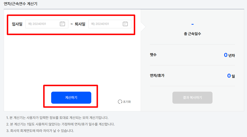 4. 계산기 화면이 나타나면 자신의 입사 연월일과 퇴사일 혹은 현재 날짜를 정확하게 입력하는 칸이 보입니다. 달력 아이콘을 눌러 날짜를 지정한 뒤 아래에 있는 파란색 배경의 계산 버튼을 누르면 즉시 결과가 산출됩니다.