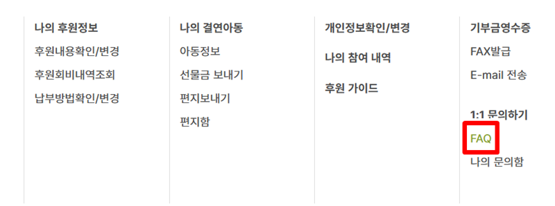 2. 나의 후원 페이지로 이동하면 좌측이나 중앙에 다양한 세부 항목들이 나열되어 있습니다. 여기서 1:1 문의하기 아래에 위치한 FAQ 항목을 찾아 선택합니다.