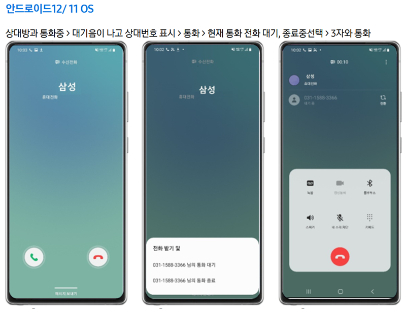 4. 안드로이드 10 버전의 기기에서도 마찬가지입니다. 통화 중 새로운 수신이 발생하면 화면에 상대방 정보가 표시되고, 전화를 받거나 대기시킬 수 있는 안내가 나타나 편리하게 관리할 수 있습니다.
