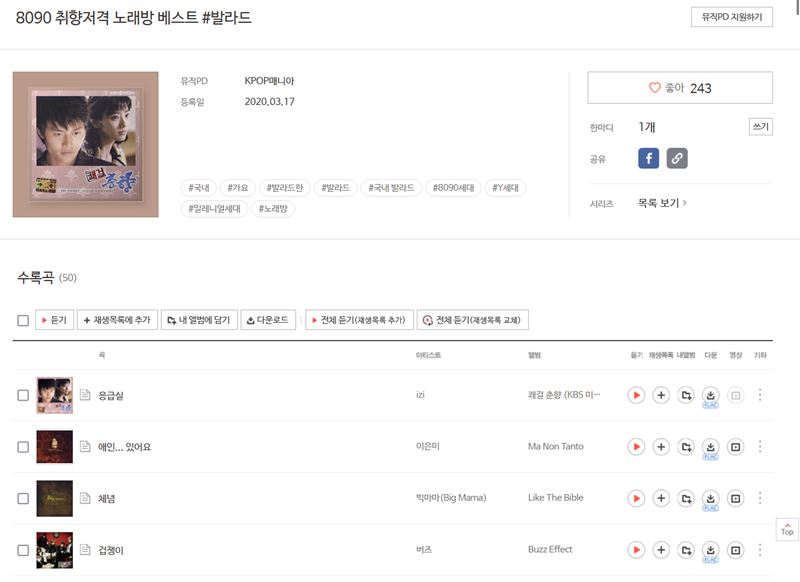 3. 만약 감성적인 발라드 명곡을 듣고 싶다면, 발라드 앨범을 선택해 보세요. 이지(izi)의 '응급실', 빅마마의 '체념', 버즈의 '겁쟁이' 등 듣기만 해도 가슴 뭉클해지는 노래들이 가득 담겨 있습니다.