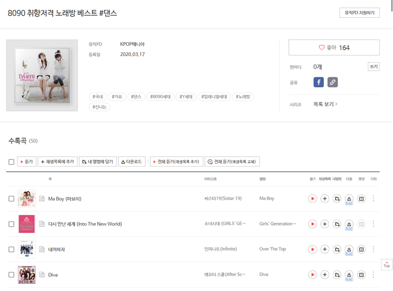 6. 신나는 분위기를 원한다면 댄스 앨범을 선택해 보세요. 씨스타19의 'Ma Boy', 소녀시대의 '다시 만난 세계' 등 듣기만 해도 어깨가 들썩이는 신나는 노래들로 채워져 있습니다.