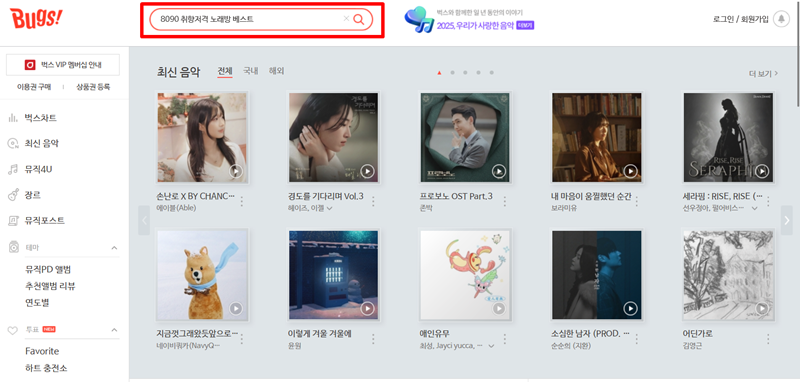 1. 벅스 뮤직 홈페이지에 접속한 뒤, 상단에 있는 검색창을 활용해 보세요. 검색창에 '8090 취향저격 노래방 베스트'라고 입력하면 그 시절 우리가 사랑했던 노래들을 만날 준비가 끝납니다.