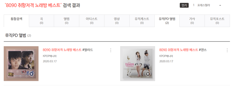 2. 검색 결과 화면에서는 발라드와 댄스, 두 가지 주제로 나뉜 뮤직PD 앨범을 발견할 수 있습니다. 그날의 기분과 분위기에 맞춰 듣고 싶은 목록을 자유롭게 골라보세요.