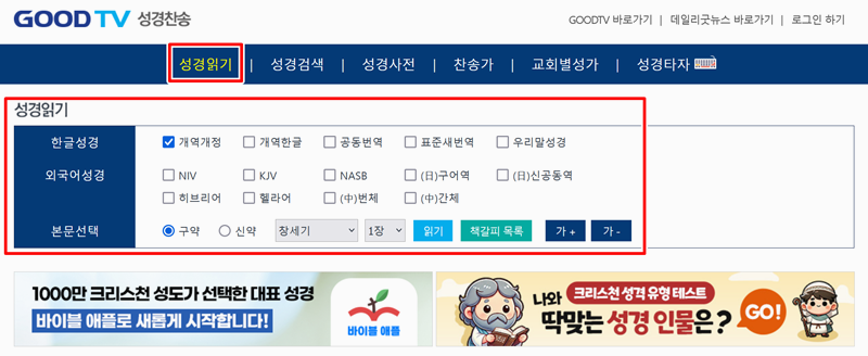 언제 어디서나 성경을 쉽게 접할 수 있도록 마련된 서비스입니다. 책을 펼쳐 읽는 것도 좋지만 스마트폰이나 컴퓨터로 간편하게 성경을 읽을 수 있어 더 접근성이 높습니다. 특히 성경을 깊이 묵상하고 싶은 분들이나 꾸준히 말씀을 읽고 싶지만 시간 내기가 어려운 분들에게 유용합니다. 단순한 텍스트 제공이 아니라 말씀을 보다 편리하게 읽고 이해할 수 있도록 돕는 다양한 기능도 갖추고 있습니다. 어디에서 알아볼 수 있냐면 good tv(구 c3tv) 홈페이지에서 직접 확인할 수 있습니다.