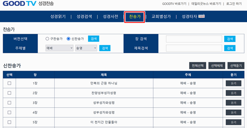 7. 찬송가를 편리하게 들을 수 있도록 다양한 기능을 제공합니다. 원하는 버전을 선택해 들을 수 있으며 주제별로도 찾아볼 수 있습니다. 구찬송가와 신찬송가를 모두 제공하며 장 번호나 제목을 검색해 쉽게 찾을 수도 있습니다.