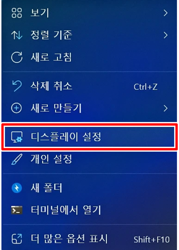 6. 이제 윈도우 11의 경우입니다. 바탕화면 빈 공간에 마우스 오른쪽을 가져가 '디스플레이 설정' 항목으로 들어갑니다.