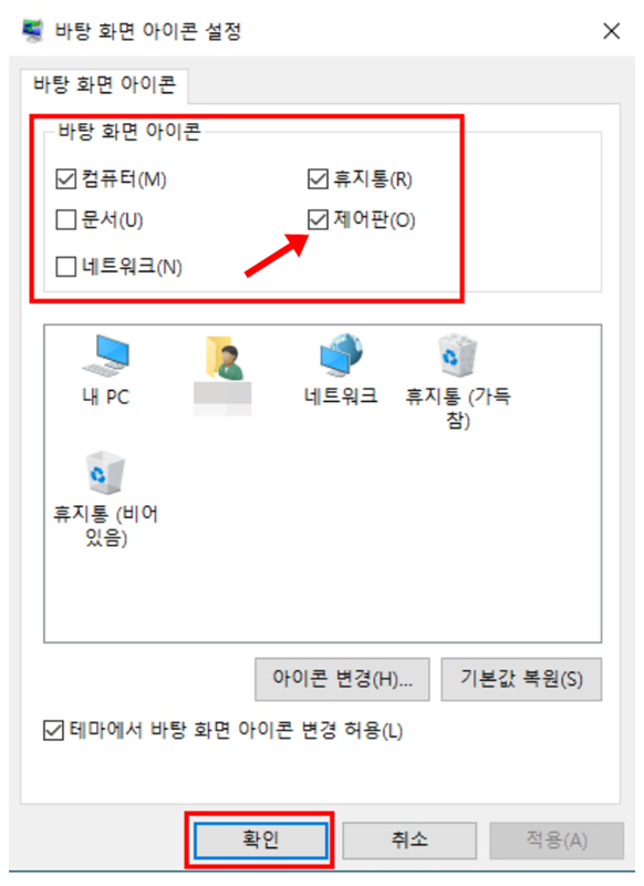 5. 바탕 화면 아이콘 설정 창에서 '제어판' 항목에 체크 표시를 한 뒤 '확인'을 누르면 바탕화면에 아이콘이 생성됩니다.