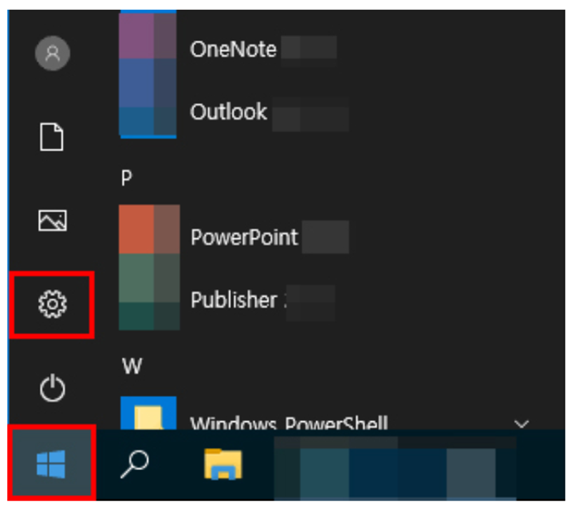 1. 윈도우 10에서 화면 왼쪽 아래 시작 아이콘을 누른 뒤, 바로 위에 나타나는 톱니바퀴 모양의 설정으로 들어갑니다.