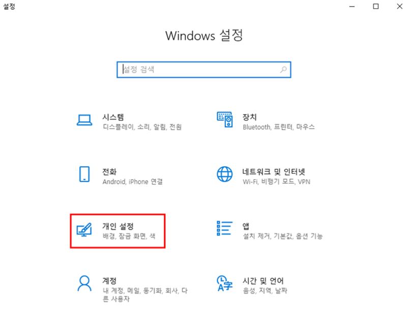2. 윈도우 설정 창이 열리면 여러 항목 중에서 배경, 잠금 화면 등을 관리하는 '개인 설정' 부분을 선택합니다.