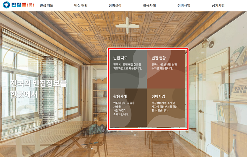 1. 홈페이지 첫 화면에서는 '빈집 지도', '빈집 현황', '활용사례', '정비사업' 등 핵심적인 내용들을 모아두어 전국의 빈집 정보를 한 곳에서 편리하게 이용할 수 있도록 안내하고 있습니다.