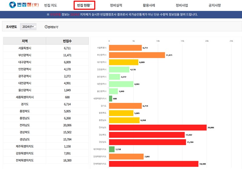 5. '빈집 현황' 항목에서는 전국 17개 시도의 빈집 개수를 표와 막대그래프로 정리하여 보여줍니다. 이를 통해 어느 지역에 빈집이 가장 많고 적은지 직관적으로 비교하며 전국적인 추세를 쉽게 이해할 수 있습니다.