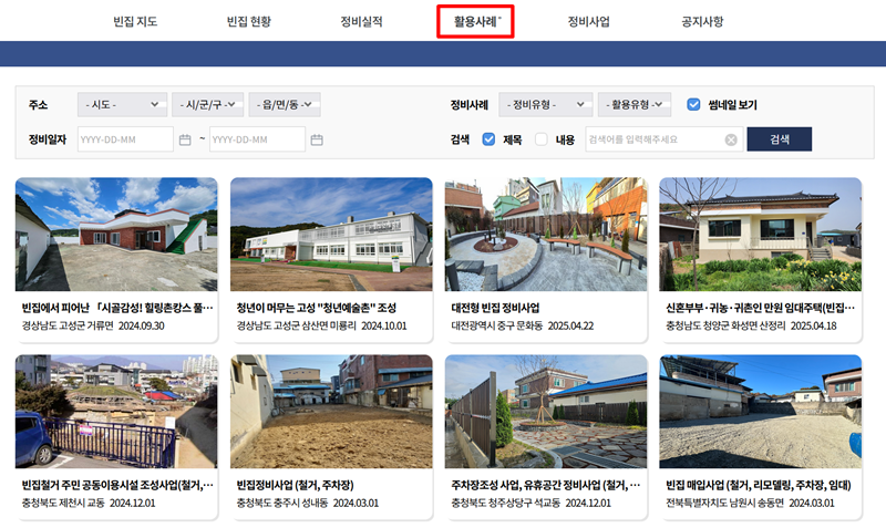 7. '활용사례' 메뉴에 들어가면 방치되었던 빈집이 멋지게 재탄생한 다양한 사례들을 사진으로 만나볼 수 있습니다. 이를 통해 빈집을 어떻게 꾸미고 활용할 수 있을지에 대한 좋은 아이디어를 얻을 수 있습니다.