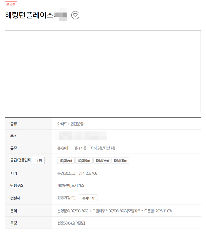 5. 목록에서 관심 있는 단지를 선택하면 상세 정보 페이지로 이동합니다. 여기서는 아파트의 종류, 주소, 규모, 공급 면적, 시기, 건설사 등 구체적인 건축 개요를 자세히 볼 수 있습니다.