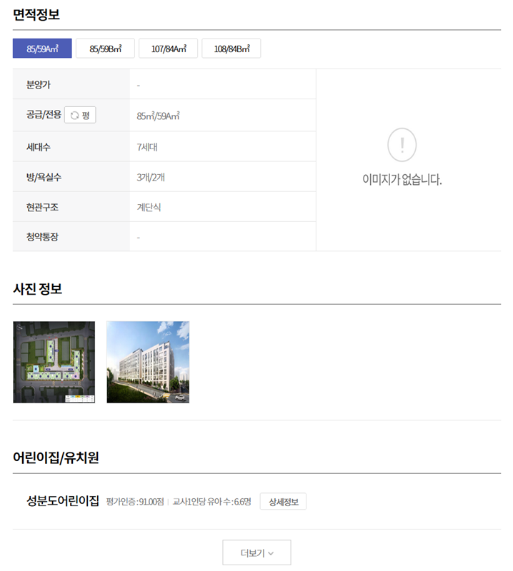 6. 면적 정보 탭에서는 각 평형별 세대수와 구조, 청약통장 관련 내용, 사진 정보, 그리고 단지 내 어린이집이나 유치원 정보까지도 제공되어 꼼꼼한 확인이 가능합니다.
