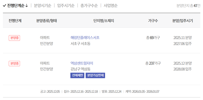 3. 지도 아래쪽에는 분양 단지 목록이 나옵니다. '분양중'으로 표시된 단지들은 현재 청약이 진행 중인 곳으로, 단지명과 주소, 가구 수, 분양 및 입주 시기 등의 기본 정보를 확인할 수 있습니다.