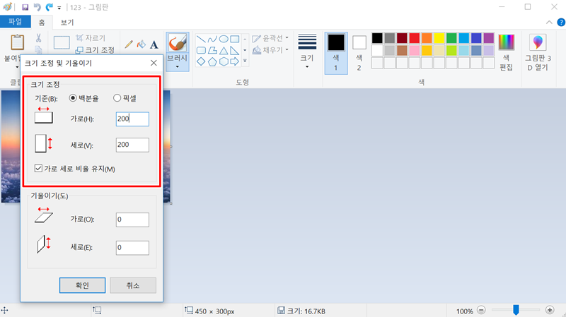 4. '크기 조정 및 기울이기' 창이 나타나면 기준을 '백분율' 또는 '픽셀'로 선택할 수 있습니다. 기본적으로는 가로와 세로 비율이 유지되도록 설정되어 있어 사진의 형태가 변형되지 않습니다.