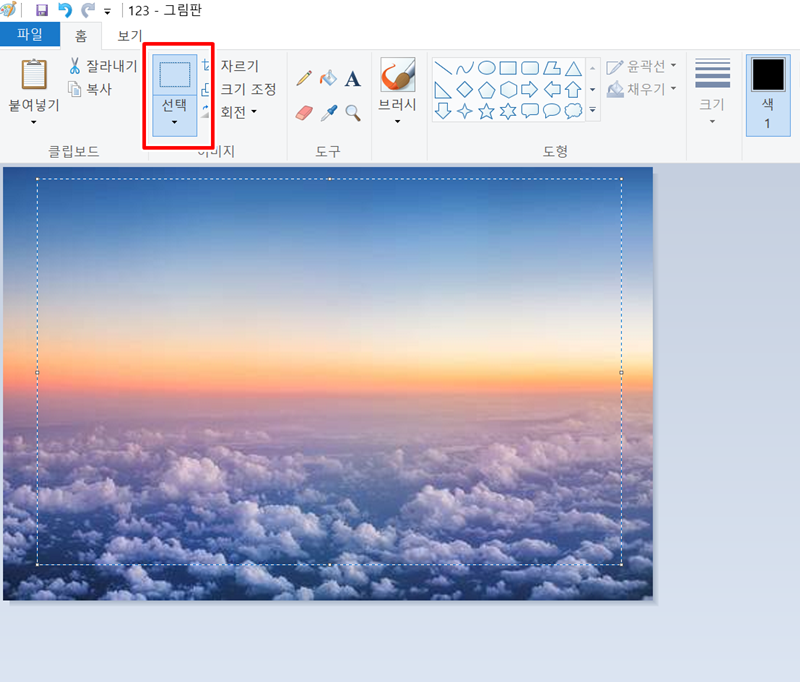 10. 다른 사진의 일부를 가져와 붙여넣을 수도 있습니다. 새로운 그림판 창을 열어 붙이고 싶은 사진을 불러온 뒤, '선택' 기능을 이용해 원하는 부분을 지정합니다.