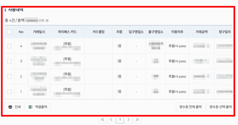 잠시 기다리니 제가 설정한 기간 동안의 하이패스 이용 기록이 목록 형태로 쭉 나타났습니다. 언제, 어느 영업소를 통해 들어가고 나왔는지, 그리고 이용요금은 얼마였는지 상세하게 확인할 수 있었어요. 업무용으로 제출해야 할 경우에는 아래쪽에 있는 '엑셀출력' 기능을 이용해 파일로 저장하거나, '인쇄' 기능을 활용하면 편리합니다.