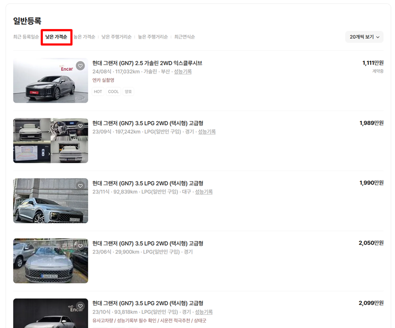 수많은 매물 속에서 내가 원하는 기준에 맞는 차를 찾기란 쉽지 않죠. 그럴 땐 정렬 기능을 활용해 보세요. 저는 '낮은 가격순'으로 매물을 다시 정렬해 봤어요. 이렇게 하면 같은 차종이라도 어떤 매물이 더 합리적인 가격에 나와 있는지 쉽게 비교할 수 있어서, 예산에 맞는 차를 찾는 데 드는 시간을 크게 줄일 수 있답니다.