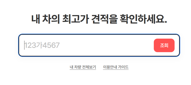 '내차팔기'를 통해 내 차의 정확한 가치를 확인하는 마지막 단계는 바로 차량 번호를 입력하는 것입니다. 화면에 보이는 입력창에 내 차의 번호판 숫자를 그대로 적고 '조회'를 누르면, 복잡한 과정 없이 아주 간단하게 내 차의 최고 견적을 확인할 수 있습니다. 이제 내 차의 가치를 정확히 알고 자신감 있게 거래를 준비해 보세요.