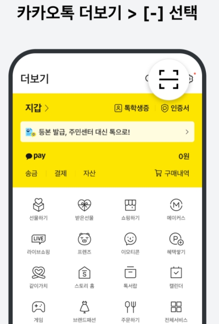 친구를 직접 선택하는 것 외에 다른 방법도 있어요. 카카오톡 화면 오른쪽 아래에 있는 점 세 개 모양의 '더보기'로 들어간 다음, 화면 위쪽에 네모난 모양의 아이콘을 선택하면 코드를 스캔해서 송금할 수 있는 화면으로 넘어갑니다.