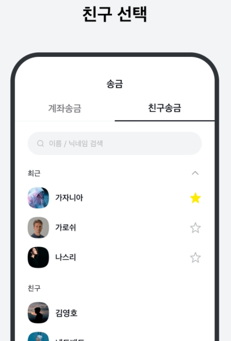 누구에게 돈을 보낼지 정하는 게 첫 번째 순서겠죠? 카카오톡 친구 목록에서 바로 송금할 상대를 고를 수 있어요. 최근에 대화했거나 자주 연락하는 친구는 상단에 따로 표시되어서 더 쉽게 찾을 수 있답니다. 저는 목록에서 '가자니아'라는 친구를 선택해봤어요.