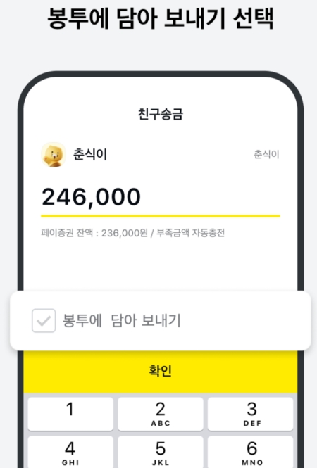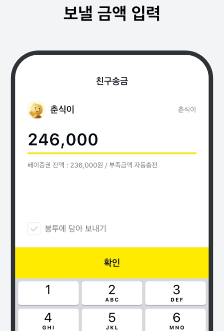 친구를 선택하고 나면 얼마를 보낼지 입력하는 화면이 나와요. 저는 246,000원을 입력해봤는데요. 이때 내 페이머니 잔액이 얼마인지도 함께 표시돼서 부족하지는 않은지 바로 확인할 수 있습니다. 금액을 정확히 입력했다면 아래에 있는 '확인'을 눌러주세요.