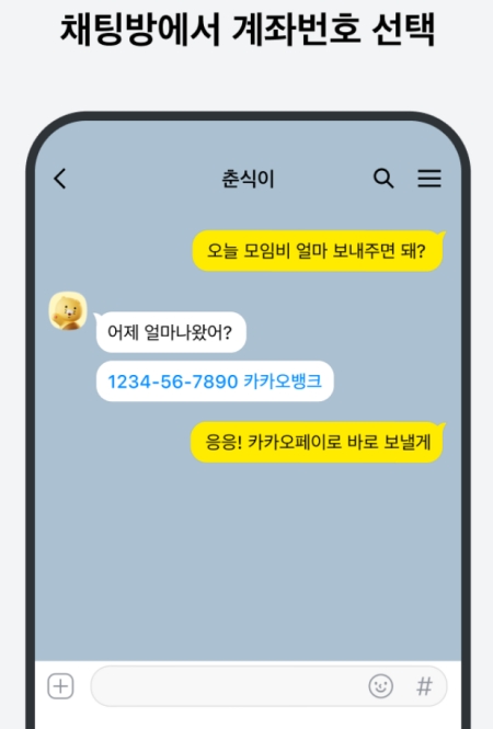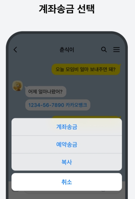 계좌번호를 누르면 이렇게 '계좌송금', '예약송금' 같은 선택지가 나와요. 여기서 '계좌송금'을 선택하면, 별도로 은행 앱을 켜지 않고도 대화창 안에서 바로 입력된 계좌로 돈을 보낼 수 있어 정말 간편하답니다.