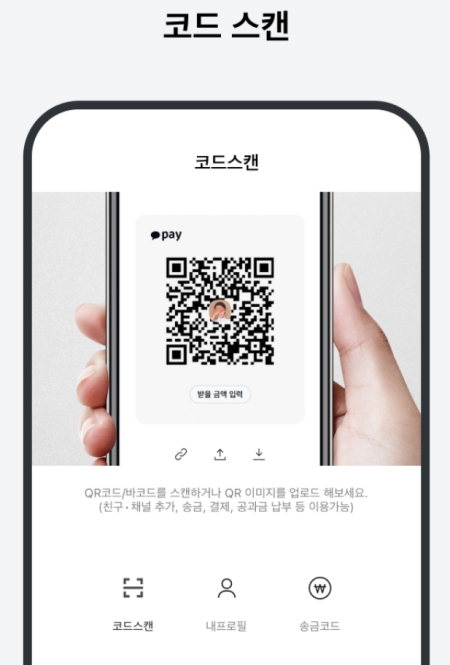 바로 이 화면인데요. 상대방이 보여주는 송금 코드를 화면의 네모난 영역 안에 맞추기만 하면 바로 돈을 보낼 수 있어요. 친구 추가가 되어 있지 않거나, 여러 사람이 모인 장소에서 빠르게 정산할 때 유용하게 사용할 수 있는 방법입니다.