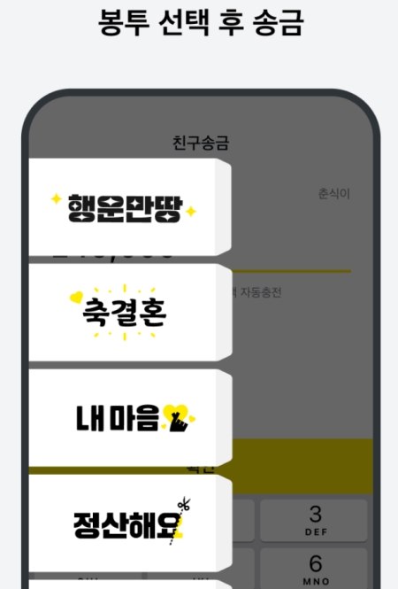 '봉투에 담아 보내기'를 선택하면 여러 가지 상황에 맞는 문구가 적힌 봉투들이 나타나요. '행운만땅', '축결혼'처럼 경조사에 어울리는 봉투부터 '정산해요'처럼 일상적인 상황에 쓸 수 있는 봉투까지 다양하게 준비되어 있으니, 상황에 맞는 봉투를 골라주시면 됩니다.