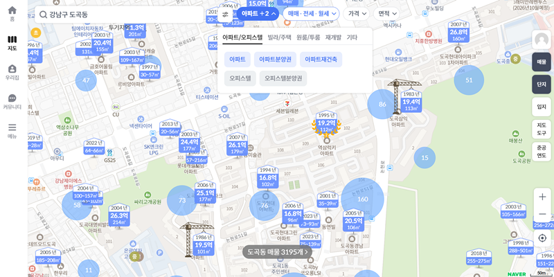 좀 더 상세한 정보를 원한다면 관심 있는 동네로 지도를 확대해 보세요. 저처럼 강남구 도곡동으로 지역을 좁히고, 상단에서 '아파트'나 '오피스텔' 같은 원하는 매물 종류를 선택하면 해당 매물들만 지도에 표시돼요. 이렇게 하면 내가 원하는 조건의 매물만 집중적으로 살펴볼 수 있어서 정말 편리했어요.
