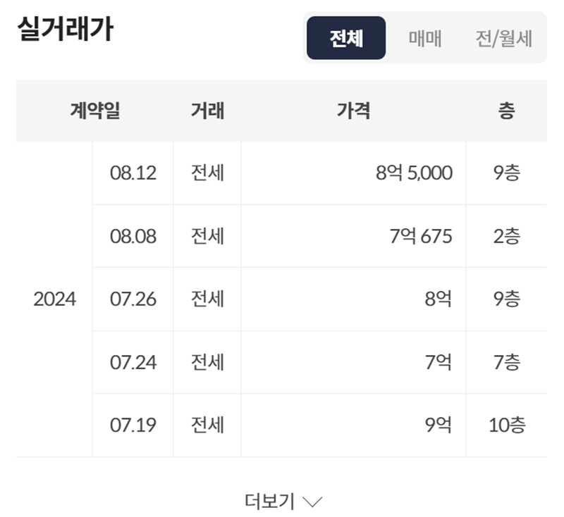 좀 더 구체적인 거래 내역이 궁금하다면 '실거래가' 목록을 확인하면 돼요. 최근에 어떤 매물들이 얼마에 계약되었는지 계약일, 거래 종류, 가격, 그리고 층수까지 상세하게 나와 있더라고요. 이를 통해 내가 원하는 층과 비슷한 조건의 매물이 얼마에 거래되었는지 참고할 수 있었어요.