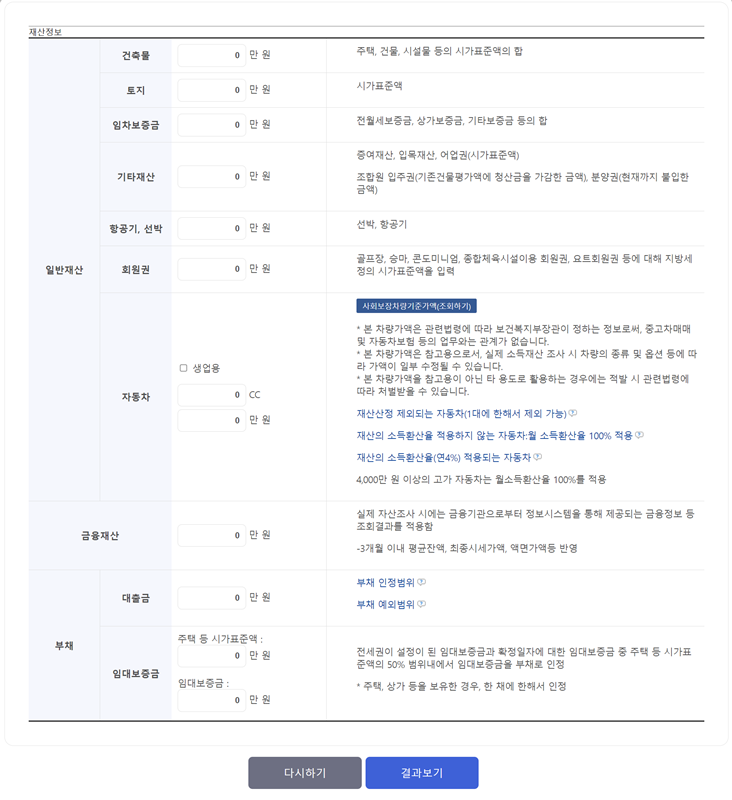 소득 정보를 모두 입력했다면 이제 '재산정보'를 기입할 차례입니다. 일반재산 항목에는 건축물과 토지 같은 부동산, 임차보증금 등이 포함됩니다. 금융재산에는 각종 예금과 증권이 해당하며, 자동차 가액도 반영됩니다. 또한, 부채가 있다면 관련 항목에 기입하여 총재산에서 공제받을 수 있으니 잊지 말고 꼼꼼히 챙겨야 합니다.