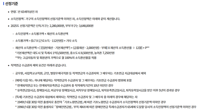 수급 자격을 결정하는 선정기준은 크게 연령, 소득인정액, 그리고 직역연금 수급 여부로 나뉩니다. 2025년을 기준으로 선정기준액은 단독가구 2,280,000원, 부부가구는 3,648,000원입니다. 소득인정액은 근로소득, 사업소득 등 월 소득평가액과 일반재산, 금융재산 등을 월 소득으로 환산한 재산의 소득환산액을 더해서 계산됩니다. 계산 방식이 다소 복잡하게 느껴질 수 있지만, 각 항목을 차근차근 따져보는 것이 중요합니다.