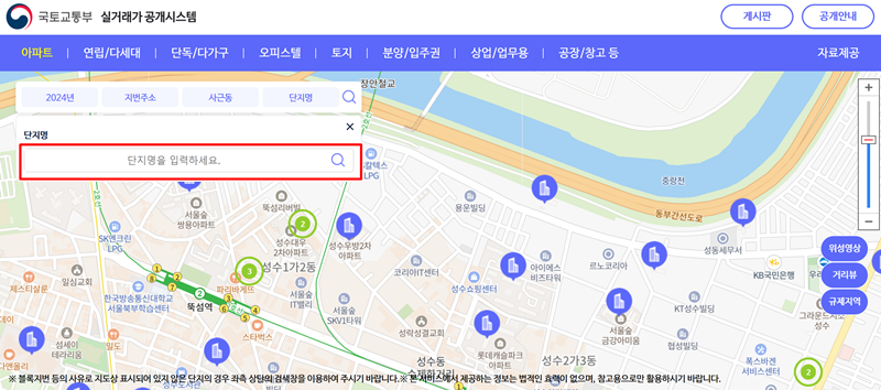 '아파트'를 선택하면 지도가 화면에 나타나고, 왼쪽 상단에 검색창이 보일 거예요. 이곳에서 내가 찾고 싶은 아파트의 이름을 직접 입력하고 검색하면 됩니다. 지도 위에 아파트 위치들이 표시되지만, 단지명을 직접 입력하는 것이 원하는 정보를 더 빠르고 정확하게 찾는 방법이 될 수 있어요.