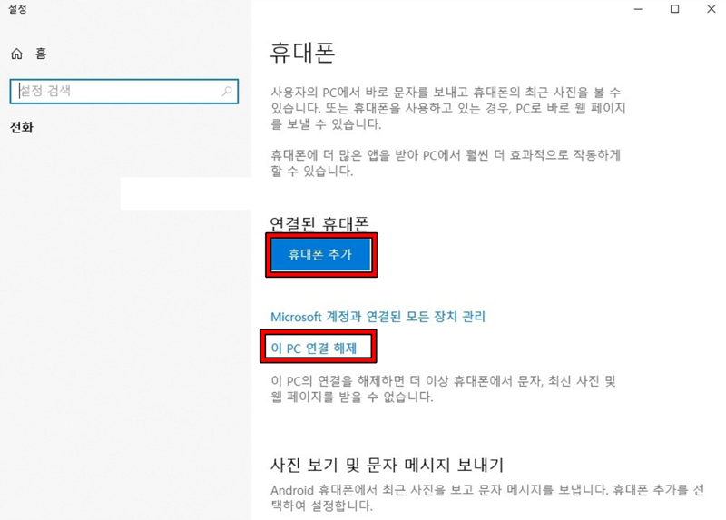 설정 화면으로 들어가니 '휴대폰'과 관련된 여러 메뉴가 보였어요. 여기서 제 휴대폰을 컴퓨터와 연결해야 하므로, 화면 중앙에 보이는 '휴대폰 추가' 부분을 선택했습니다. 이미 연결된 기기가 있다면 목록에 나타나겠지만, 저는 처음 시도하는 것이기 때문에 이 과정을 거쳐야 했어요.