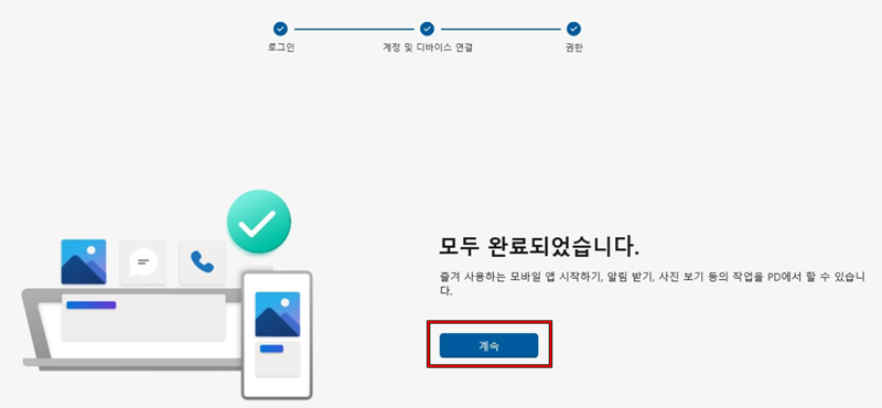 모든 인증 과정이 성공적으로 끝나자 '모두 완료되었습니다'라는 반가운 메시지가 화면에 나타났어요. 이제 거의 모든 준비가 끝난 셈이죠. 다음 화면으로 넘어가기 위해 하단의 '계속' 부분을 눌러주었습니다.