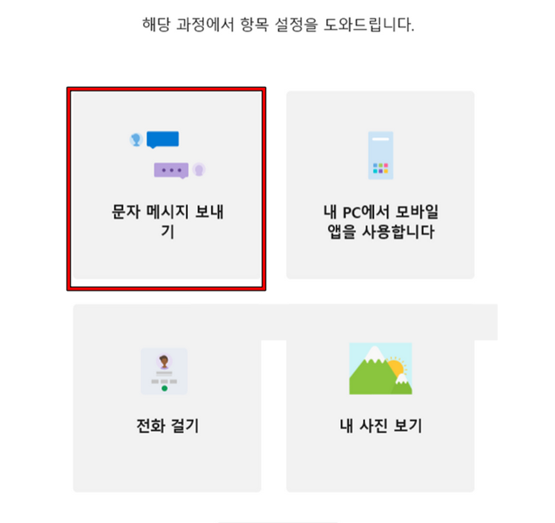 이제 어떤 기능들을 사용할지 정하는 단계에요. 메시지 보내기, 모바일 앱 사용하기, 전화 걸기, 사진 보기 등 다양한 기능들이 있었는데, 저는 가장 필요했던 '문자 메시지 보내기'를 먼저 설정하기로 했습니다.
