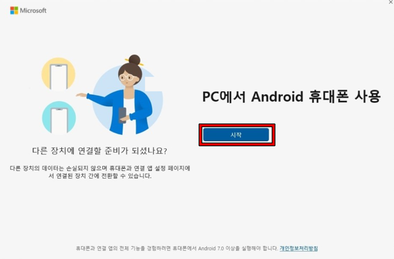 이어서 'PC에서 Android 휴대폰 사용'이라는 안내 문구가 나타나는 창이 열렸어요. 본격적인 연결을 시작하기 위해 망설임 없이 화면 중앙의 파란색 '시작' 부분을 눌러주었습니다. 이제부터 화면의 안내에 따라 차근차근 진행하면 됩니다.